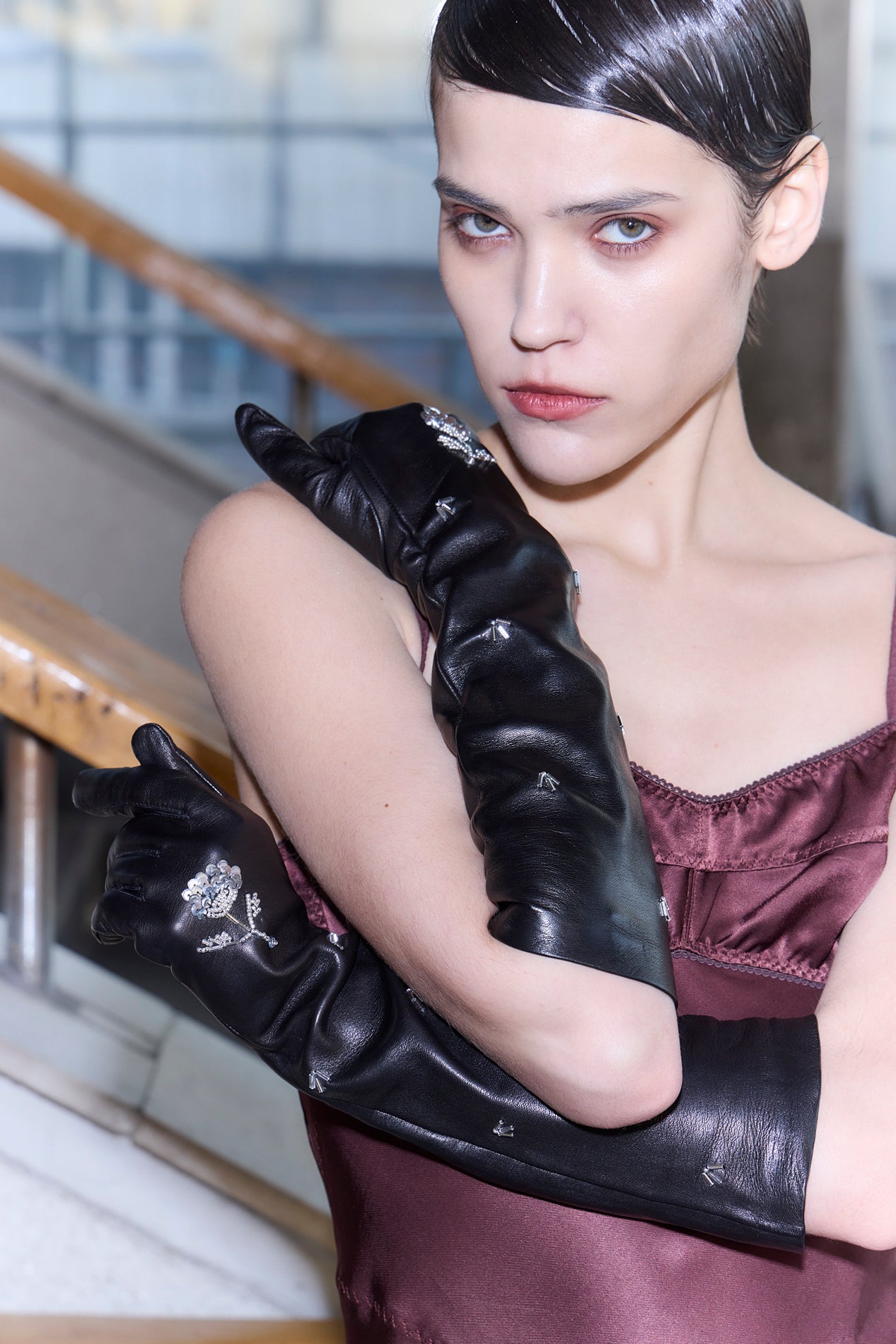 Add a touch of casual glamour with our opera-length Tora gloves. Made from stretch faux leather and adorned with hand-embroidered crystal embellishment, these gloves balance elegance and edge. The perfect accessory for sneaking cigarettes between courses.